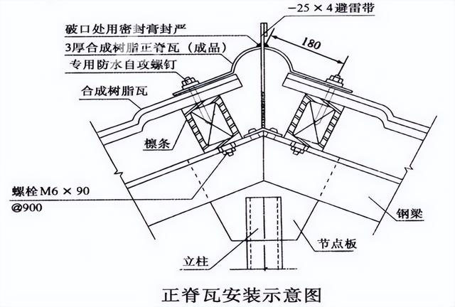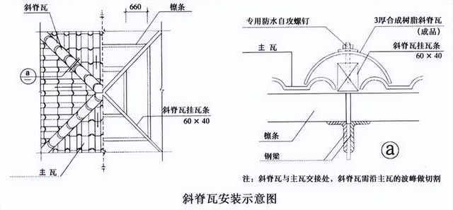 正脊瓦和斜脊瓦分別安裝在屋脊CD線和斜邊上。正脊瓦的安裝要從主瓦區(qū)的一側開始,確保第一張正脊瓦的搭接處不與主瓦的搭接處重疊,而是相互錯開。兩張正脊瓦之間要搭接一個波形,以確保防水性能。斜脊瓦安裝在多坡屋面的斜邊上,要確保上下對齊并固定在主瓦的檁條上,兩節(jié)斜脊瓦之間要搭接30mm,最后安裝脊瓦的末端。
